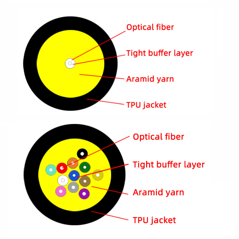 Unimodal, de doble finalidad, el cable de la fibra se diseña para una multitud de usos y es conveniente para el empuje y las instalaciones micro sopladas los hasta 50m del uso del conducto así como aéreas. Su chaqueta estabilizada ULTRAVIOLETA hace conveniente para interior y al aire libre